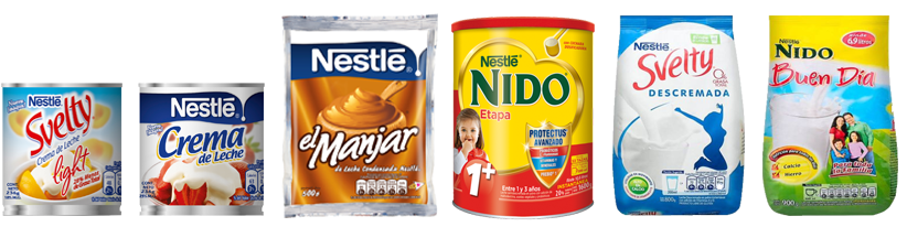 Nutrición completa para grandes y chicos. Los lácteos conforman un gran alimento que puede ser consumido de diversas maneras: puede tomarse como bebida, es ingrediente básico en tortas, queques y dulces, sirve como acompañante de cereales, complemento de preparaciones para bebidas y es fundamental en períodos de lactancia para bebés. En base a lo anterior, te ofrecemos diferentes presentaciones que se acomoden a las necesidades de tu negocio, contando con productos como: Crema de Leche, Leche Condensada, Manjar, Leche Nido, Nido Instantánea para Niños, Nido Buen día, Svelty.
